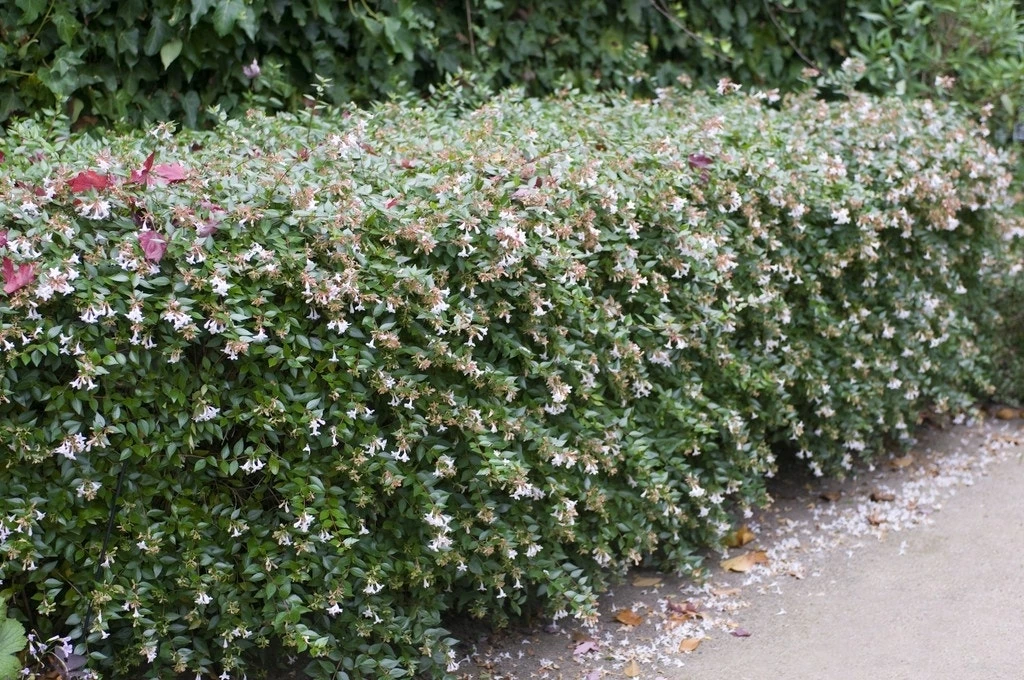 Abelia grandiflora is een halfwintergoene bloemheester waarvan de takjes overbuigen. Het is een zeer fraaie borderplant, maar kan ook als haagplant worden gebruikt. Het is een lange en rijke bloeier van juli tot oktober met witroze klokvormige bloemetjes. De Abelia verlangt een beschutte standplaats. Van nature groeien de Abelia’s bolvormig, ze worden dus even hoog als breed (zoals een hortensia).