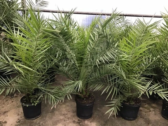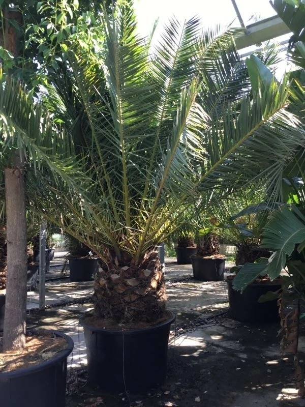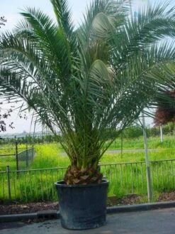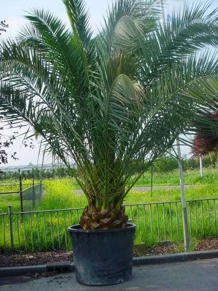 Phoenix canariensis (Canarische dadelpalm) is een bijzonder sierlijke palm met geveerd blad. Oudere exemplaren hebben een opvallende dikke stam. De dadelpalm geeft meteen een exotische vakantiesfeer aan de tuin. Deze vederpalm kan het beste al kuipplant gehouden worden, zodat de palm in de winter naar binnen gehaald kan worden.Â