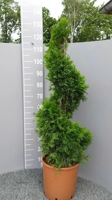 Thuja occidentalis ‘Smaragd’ in spiraalvorm.