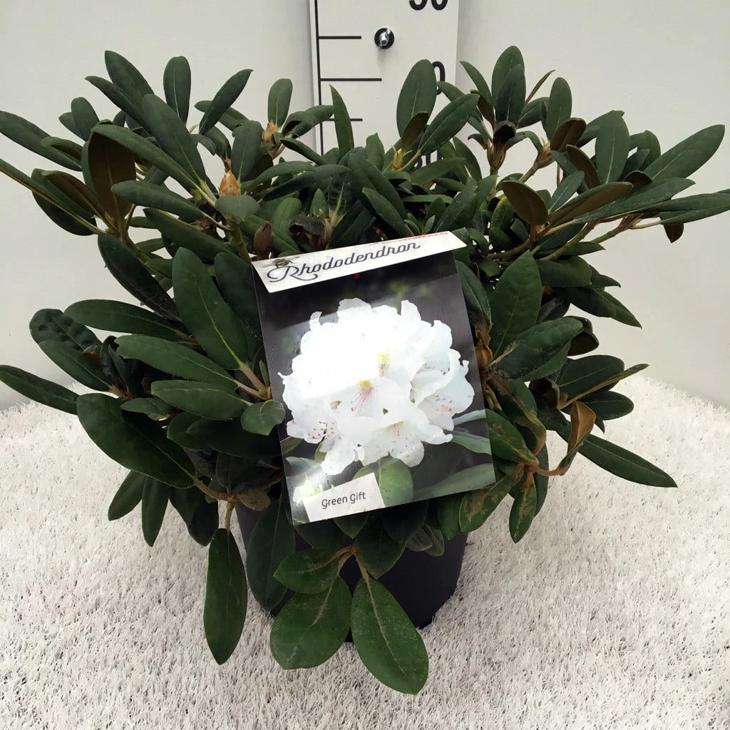 Rhododendron ‘Porzellan’ bloeit vroeg in het voorjaar vanaf eind april tot begin juni verschijnen witte bloemen.