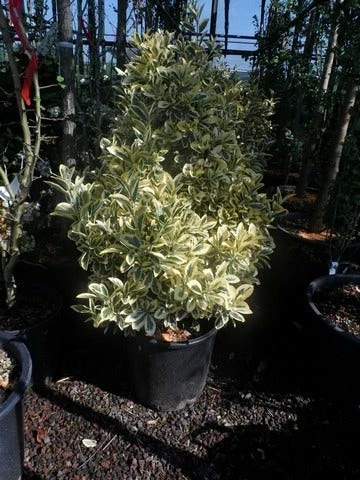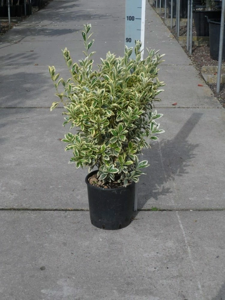 Euonymus japonicus ‘Bravo’ is een witbonte wintergroene heester.
