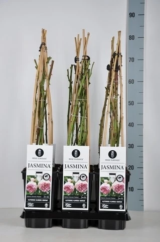 Rosa ‘Jasmina’ (roze klimroos) is een bloeirijke en geurende klimroos met gezond blad. De roze, gevulde bloemen worden ongeveer 8cm in doorsnede. Rosa ‘Jasmina’ wordt ongeveer 300cm hoog en ongeveer 100cm breed en wordt geleverd in vierkante pot met een inhoud van 3 liter en 3 stokken. ADR-roos 2007.