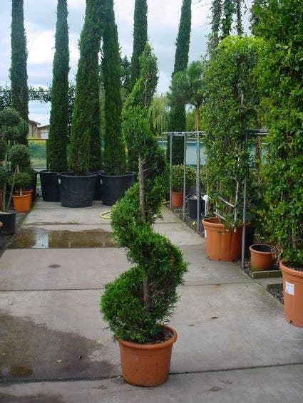 Cupressocyparis leylandii ‘Castlewellan Gold’ gekweekt als spiraal.