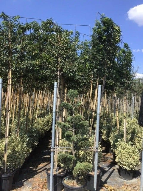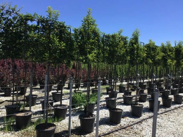 De afmeting van het leirek van de boom met een stamomtrek van 8/10cm is 120cm breed en 100cm hoog. De stamhoogte van de bomen is circa 200cm, waarna het leirek begint.