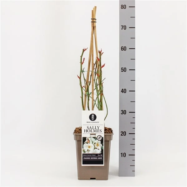 Rosa ‘Sally Holmes’ is een enkelbloemige roos met cremewitte bloemen met een zweem roze. Bloeit opvallend lang en rijk en geurt heerlijk.