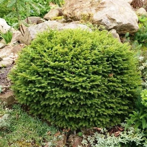 Compact groeiende dwergconifeer. Wintergroen. Bolvormige groeiwijze. Hoogte circa 50 cm. Breedte ruim 1 m. Korte heldergroene naalden, dicht opeen. Zeer winterhard. Geschikt voor de rotstuin. Humusrijke grond.