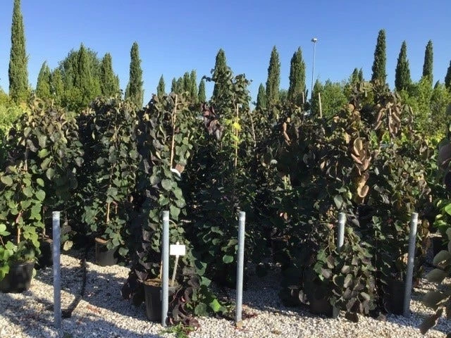 Cercis canadensis ‘Ruby Falls’ is een treurvorm van de mooie judasboom. Deze Cercis bloeit rond april met opvallende dieproze bloemen, waarna de boom in blad komt. Het kenmerkende blad is paars-rood en hartvormig. In de zomer verkleurt het oudere blad naar groen.