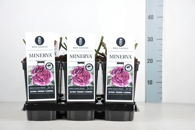 Rosa ‘Minerva’ is een mooie, doorbloeiende trosroos met bloemen die paars gekleurd zijn en later in het jaar naar blauw verkleuren. Momenteel is dit de meest blauwe roos! Rosa ‘Minerva wordt ongeveer 70 cm hoog en 50 cm breed. Deze roos heeft glanzend en gezond blad, de bloemen hebben een diameter van ongeveer 8 cm. Deze roos verspreid een heerlijke kenmerkende rozengeur Hijn wordt geleverd in een vierkante pot met een inhoud van 3 liter.