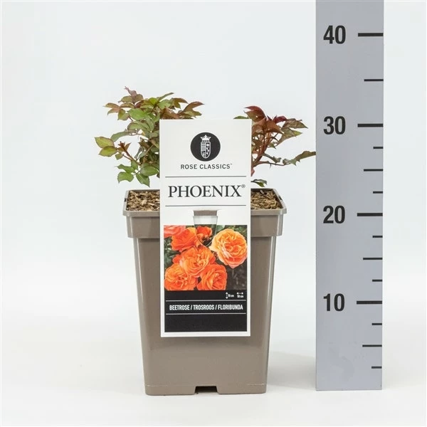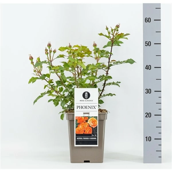 Rosa ‘Phoenix’ is een trosroos (Floribunda) met gevulde helder oranje bloemen.