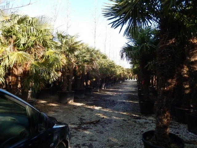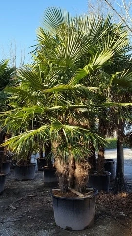 Trachycarpus fortunei gekweekt als solitaire palm met 3 stammen. Goed winterhard tot -18 graden) kunt u in de winter gerust buiten laten staan. De bladeren zijn groot en waaiervormig. Na de winter zijn vaak de onderste bladeren lelijk geworden, deze kunt u eraf snoeien. Uit het hart van de palm komen weer nieuwe bladeren tevoorschijn. In de nazomer komen er soms, na een warme zomer, onder het bladerdek grote bloempluimen tevoorschijn! Trachycarpus fortunei is een vrij snelle groeier onder de winterharde palmen, de stam groeit circa 20 cm per jaar. Trachycarpus fortunei staat graag op een licht beschutte plek. Als u de winterharde palm in een pot houdt is het belangrijk dat u hem af en toe voeding geeft, bijvoorbeeld met kunstmest of vloeibare mest.